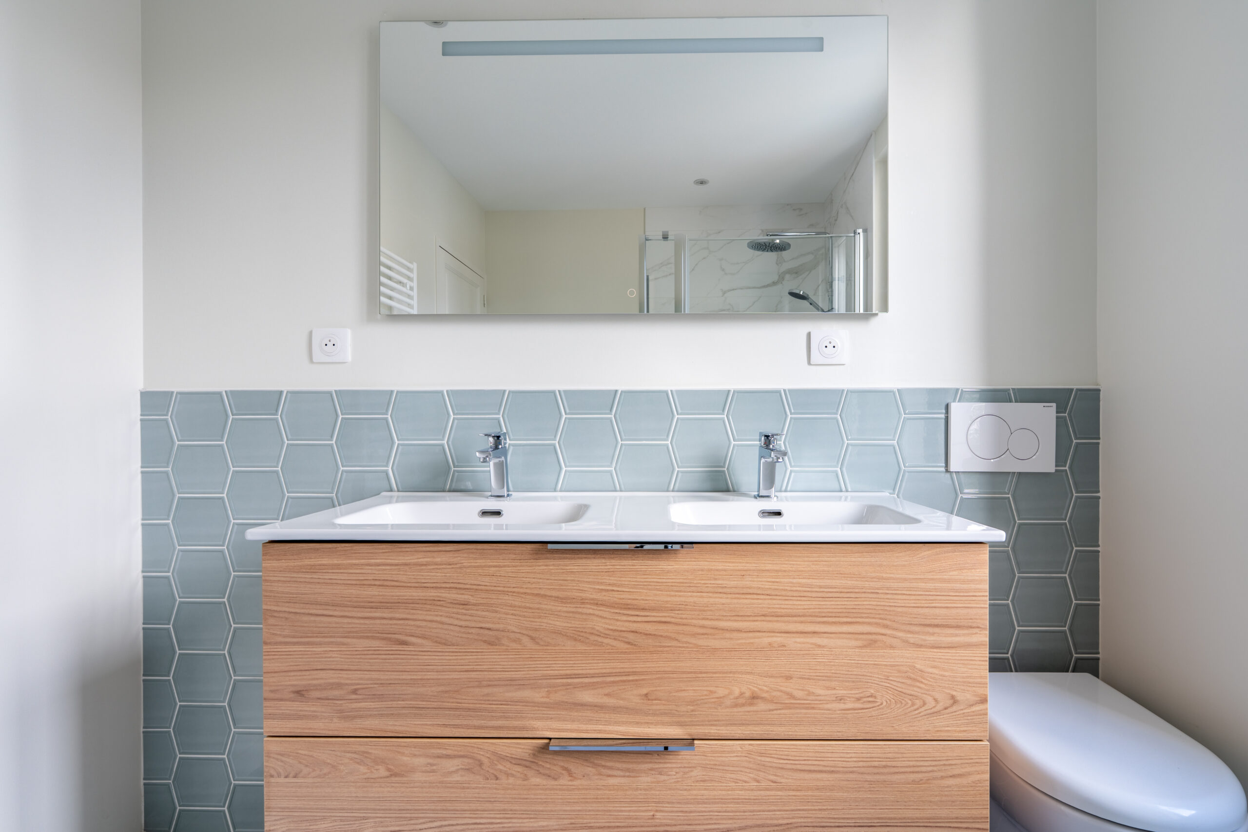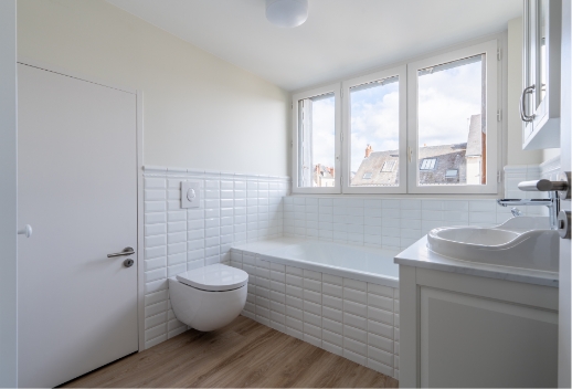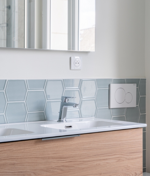 En collaboration avec un bureau d’études, les planchers ont été reconstruits, les cloisons repensées, et l’ensemble des réseaux techniques entièrement repris :