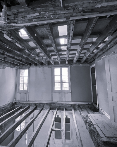 Le rez-de-chaussée avait été entièrement décloisonné sans renfort structurel, entraînant une déformation progressive des planchers des étages supérieurs.
