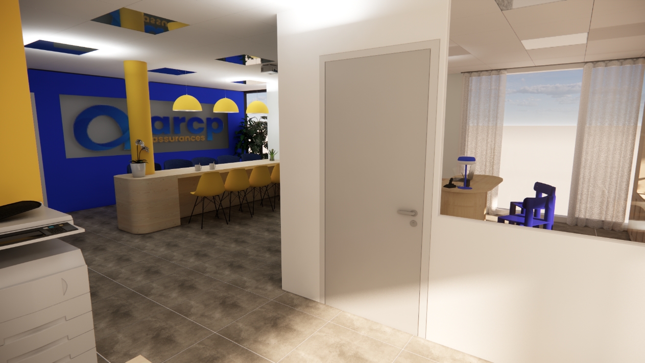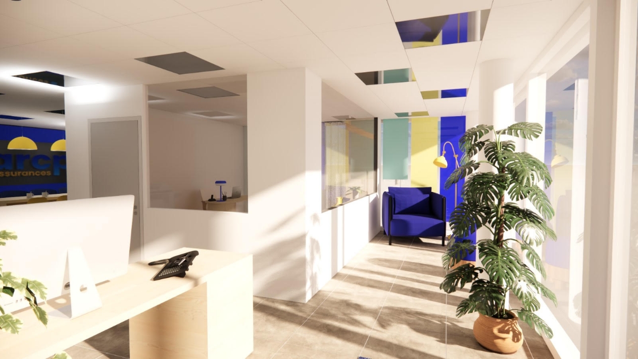 Dans le cadre de l’installation de cette agence d’assurance indépendante dans des locaux neufs au rez-de-chaussée d’un immeuble situé à l’angle de l’avenue Maginot à Tours Nord, j’ai assuré la mission de conception pour l’aménagement sur mesure des espaces professionnels : accueil, open space, bureaux fermés, salle de pause et salle de réunion.